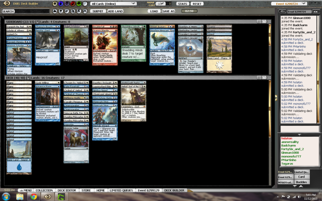 Problem was, I should have (looked back, that is). As you can see, while I did snag a pair of Ordeals and a Heliod (which, whatever), I never saw a single Wingsteed Rider, Favored Hoplite, or another Battlewise Hoplite. I ended up having to play Bronze Sable and Anvilwrought Raptor in order to keep my curve as low as possible (with Horizon Scholar and Prescient Chimera in the board, which I almost always boarded into).