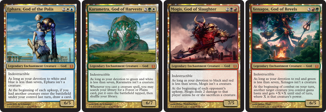 The big reveal this week was that Born of the Gods will contain five new gods, and they will be two colors each. They will represent friendly-colored pairs going around the pentagon on the back of the card and require seven devotion, combined, to each color to become animated. So far, four of the five have been revealed, saving the Dimir god for the second week of spoilers. Let’s check out the four we’ve seen so far: