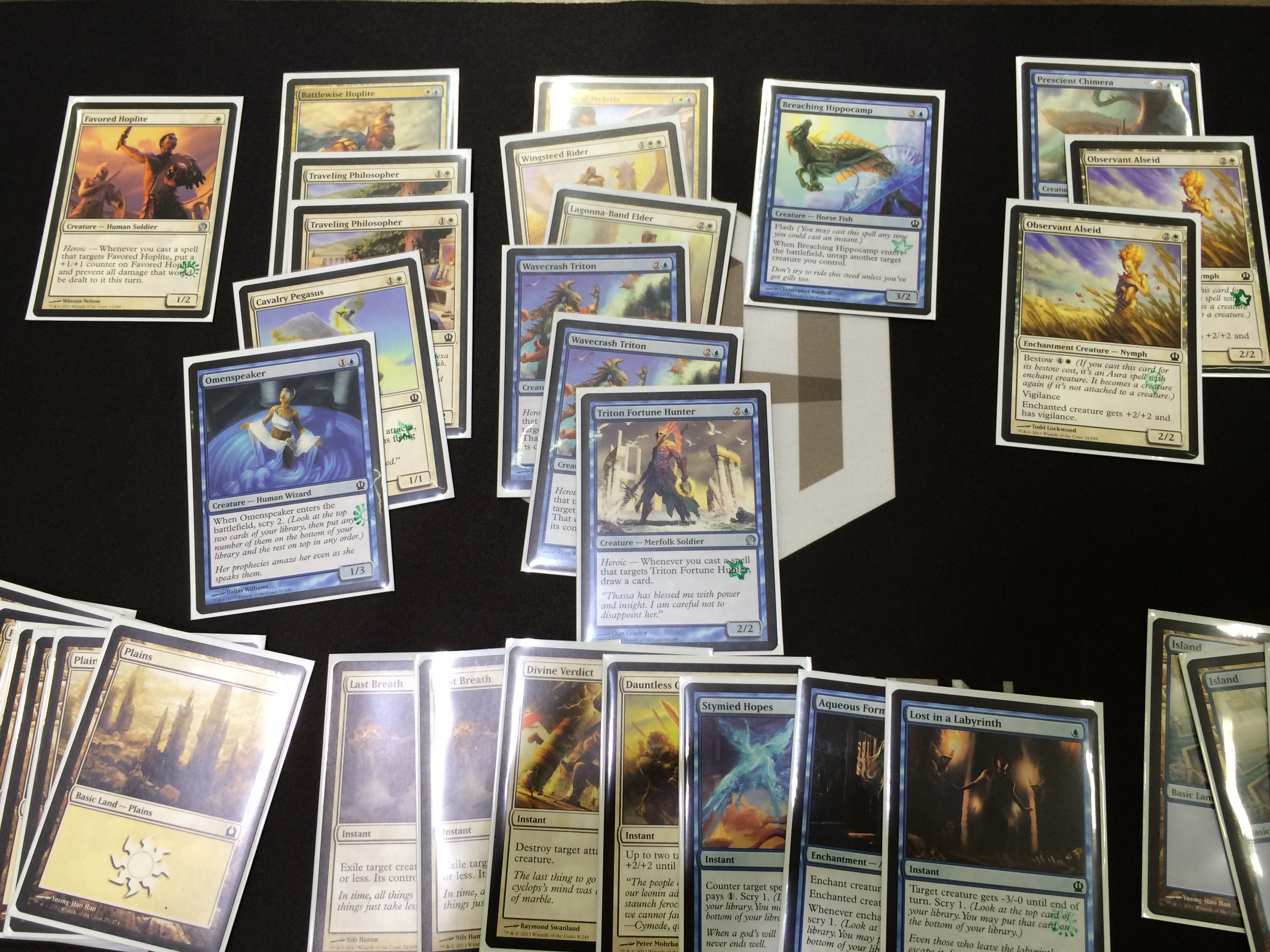 I probably should have put the second Lost in a Labyrinth in the main deck so I could have some way to use my Wavecrash Tritons. Last Breath is pretty horrible in a weak aggressive deck, as the four life is a big deal, but I figured it could enable heroic in a pinch. Lost in a Labyrinth probably does it better, though. How much does my deck have to suck for this to be an actual conversation? Oof.