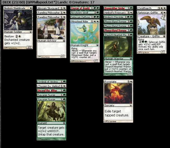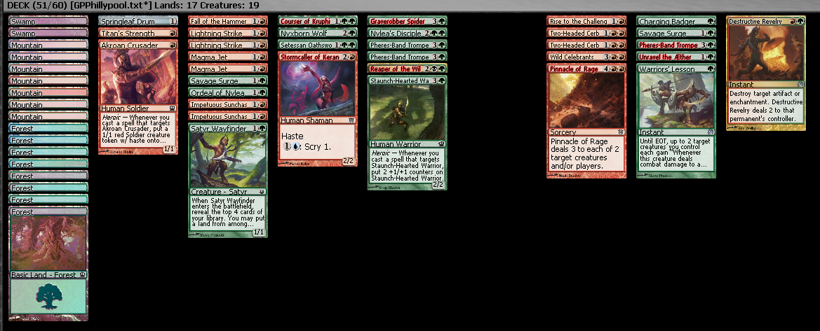 Naturally my first instinct was RG, because of the removal, the Courser, and the Reaper, which I knew I could splash relatively easily with a Springleaf Drum, a Satyr Wayfinder, and the Ordeal of Nylea (which is not of course “real” fixing, but it helps). But then I lay out the build and it’s pretty sketchy, with no one- or two-drops other than an Akroan Crusader, a pair of Impetuous Sunchasers … and of course that metric fuck-ton of removal. Slots three and up looked great, though, with the aforemenioned Courser, a Nyxborn Wolf, two Pheres-Band Trompers, and more.