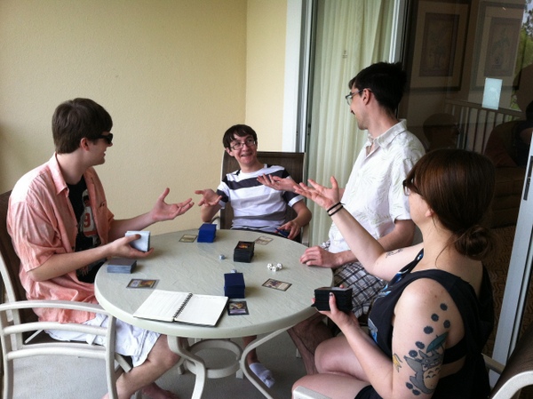 Anyway, on Sunday, we did what Magic players do when you put them in a room together. We played a big game of EDH. Despite the fact that we had a dinning room table that would comfortably accommodate the five of us, my brother Eric talked us into playing on the deck. “It’s just more picture-esque. It will be better for your article.” We left the cool comfort of the AC tempered room for the humid Florida air and started to shuffle up.
