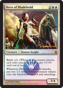 But then Wizards made a couple of changes that started us down the current path. First, they stopped focusing on a single awesome promo card. In Mirrodin Beseiged you could choose from a promo Glissa the Traitor and a promo Hero of Bladehold depending on your chosen alignment. It was gimmicky, and coming at the same time that they canceled the Player Rewards Program made it feel a little special, like this was a one-time apology for them screwing that up. It was not a one-time thing, though.