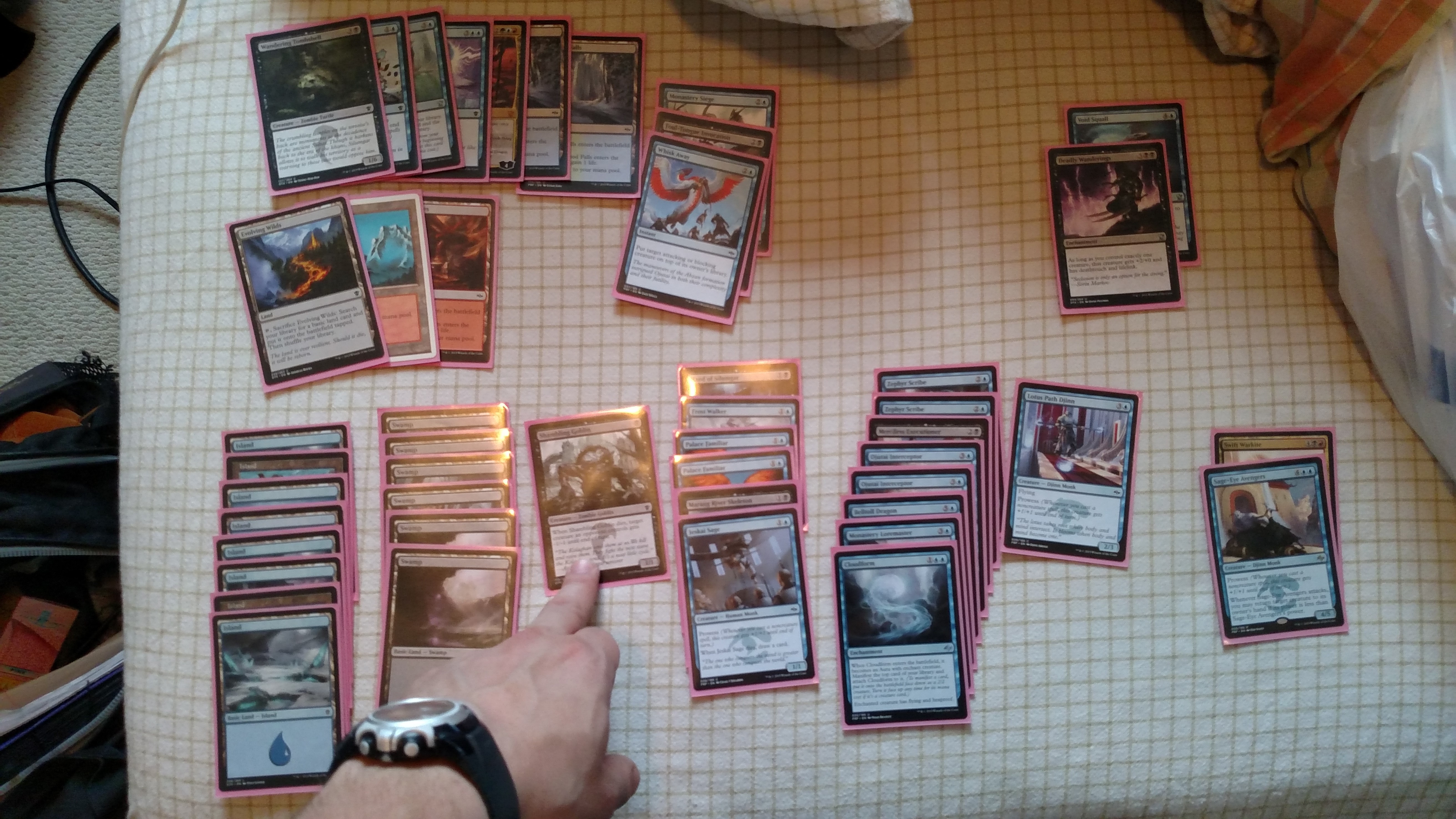 …then I took a P1P2 Foul-Tongue Invocation, ’cause it was the best card in the pack. I saw that blue was the most open color while red-green was not at all open, and snagged a few good black cards. Blue remained open (only me and Hunter, who was directly to my left, were in blue) and I was thoroughly rewarded for being heavily blue in pack three (P3P3 Monastery Siege, along with all the other blue cards you’ll see below). By draft’s end, I’d picked up a bunch of fixing and red cards, but not enough to play Sarkhan in the main. I splashed red for the very powerful Swift Warkite (which also had great synergy with Foul-Tongue Invocation), but nothing else. In the end, I was UBr control with zero Exploit creatures.