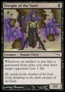 Naturally, Christian Calcano’s Dimir Aristocrats deck caught my eye during the Pro Tour coverage. Pascal Maynard built the deck, and it really solves the Nantuko Husk problem. Husk is the key piece of the deck, the only free and repeatable sacrifice outlet available other than Butcher of the Horde, but if you can’t make it evasive you have to devote more card slots to alternate win conditions. Now that Mogis’s Marauder is gone, it’s hard to make a giant husk unblockable. Rogue’s Passage is too slow—you can play one if you want, but you can’t rely on having it when you need it.