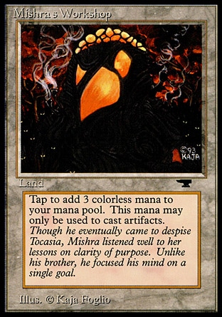 - Mishra’s Workshop. It is, without a doubt, one of the most powerful lands in Magic. Making three mana on turn one is the stuff of Black Lotus. Mishra’s Workshop does that every turn. It’s in one of the strongest Vintage decks and banned in Legacy.