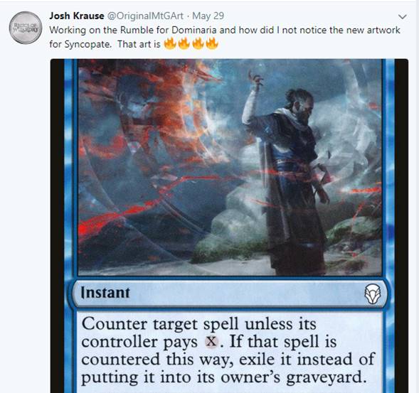 Fast forward two months. Josh Krause from Original Magic Art posts on Twitter about just how great the new Syncopate art is as he was preparing his Reprint Rumble series for a Dominaria edition.