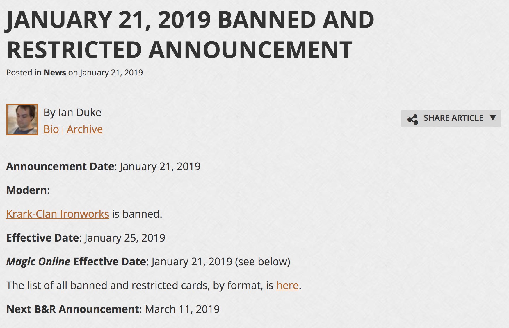 Monday brought the highly anticipated Banned & Restricted update. Wizards of the Coast seem to like giving Modern a soft-reset early in the year, if we take the unbanning of Jace, the Mind Sculptor and Bloodbraid Elf as an example. Whether or not that was a goal for this update, the banning of Krark-Clan Ironworks has immediate impact on Modern.