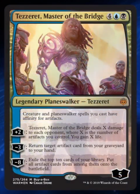 We already knew that there would be 36 Planeswalkers in War of the Spark, but today’s panel revealed that a 37th planeswalker would be the exclusive Buy-a-Box promo: Tezzeret, Master of the Bridge.
