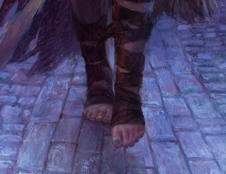 At this size, Ryan’s brushstrokes are larger than life, from the cobblestone beneath Arlinn’s feet or the magic emanating from her fingers. The Ravnican skyline is detailed yet doesn’t detract, and the dusky purples and pinks of the horizon are reminiscent of what used to happen to our title character when the sun went down.