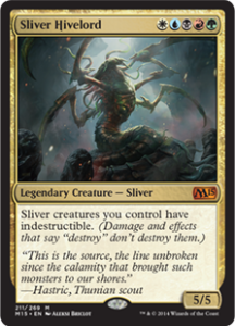 Some vocal players see M15’s Slivers as a mockery of the creature type—by affecting only their controller’s Slivers and changing the iconic look of the original, they argue it dilutes the joy of a Sliver deck. I don’t agree, but I do see their point when I look at the Hivelord. It’s a vital piece of a Sliver deck, but it’s not a 7/7. Plus it disrupts the predictable pattern of Legendary Slivers, embodying the changes foisted upon the classic casual tribe.