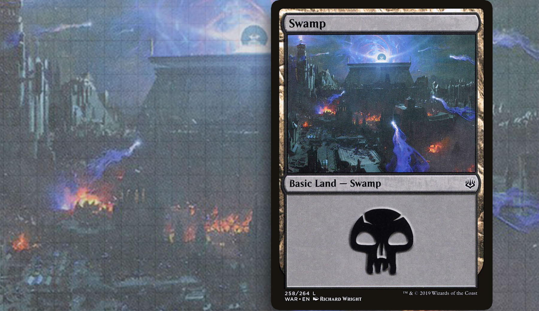 If you would have asked me eighteen months ago what lands were capable of doing in a Magic set, I would have said a whole lot in terms of setting the tone and helpful worldbuilding. I don’t think I would have openly said that I thought you could boldly and vibrantly represent the central plot of a set on lands, let alone a single Swamp. Richard Wright’s piece—while helped by the other basic lands in the panoramic shot—communicated War of the Spark perfectly.