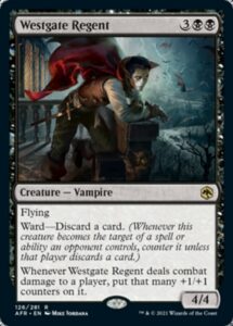 Westgate Regent is both a painfully fair bomb and a new kind of frustrating. It’s the first creature to have a Ward cost that’s neither life loss nor mana, and man is that powerful. Makes one wonder what other kinds of Ward we’ll see in the future. Sacrifice a creature? Mill 10? They draw a card? There’re a lot of possibilities, though I think I’d like a bit more time to get used to Ward before its boundaries are pushed again.
