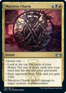 Maestros Charm is the third charm in Grixis colors, following 2008’s Grixis Charm and 2001’s Crosis’s Charm. It’s not surprising to see a new charm in Grixis colors—we’ve gotten tricolor charms in every tricolor set (aside from Ikoria which had the Emergent Ultimatum cycle)—though it’s impressive how different is from its forebears.