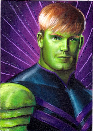 This painting is extra intense; just look at those eyes! A man of metal on a steel-cold background, the bit of contrasting color from the flattened fire all lend to making this one good looking trading card.