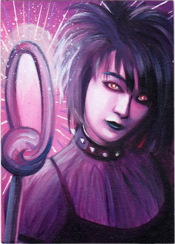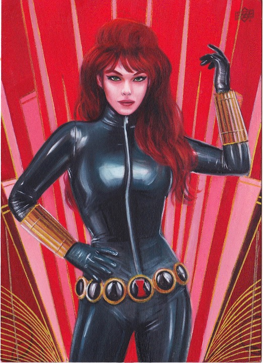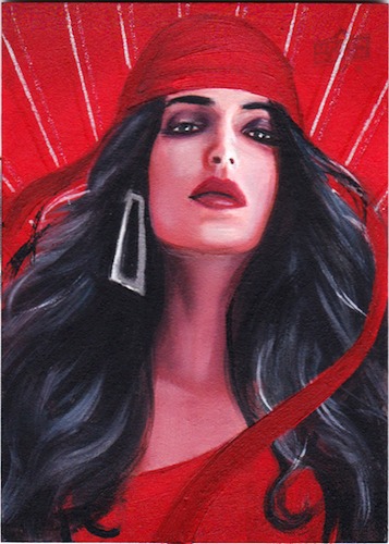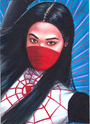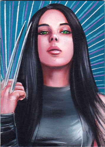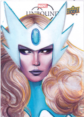 Layered amongst the animals of her Inuit origins, Snowbird, painted at the larger of the two sizes the artist works in, is a sight to behold! In all her blizzarding glory, the superimposition of these symbols alongside her contemporary costume make this a new high note in the character’s card history.