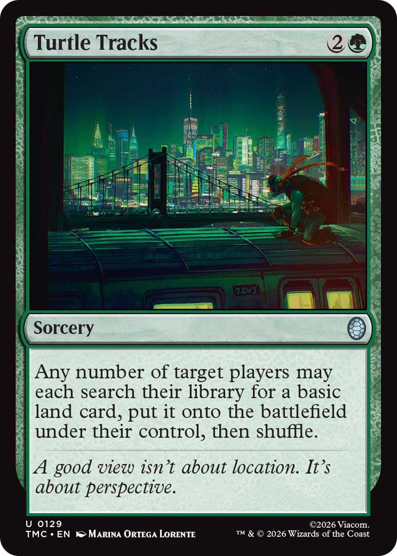 An exceptionally flavorful card, Cowabunga! is a one green mana sorcery that lets you dig through the top four cards of your deck for a Mutant, Ninja, Turtle, or land card and add it to your hand. While a bit narrower than other similar cards, it is a very fun addition and likely a staple in any deck running the Turtles.
